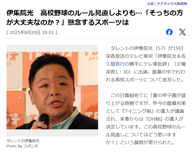 タレントの伊集院光(57)が19日深夜放送のテレビ東京「伊集院光&佐久間宣行の勝手にテレ東批評」(火曜深夜1・30)に出演。酷暑の中で行われる高校スポーツについて言及した。