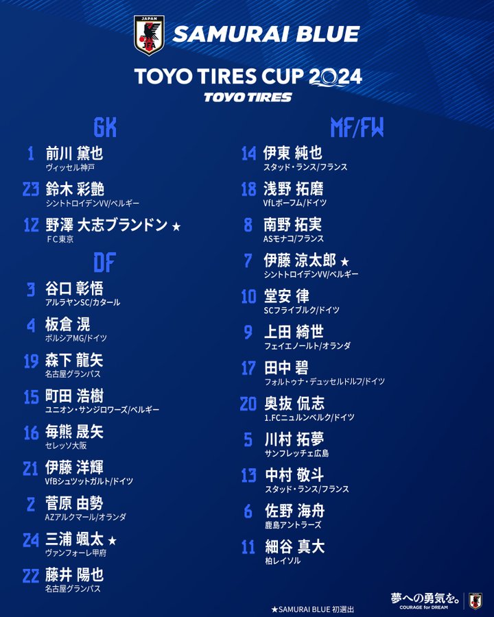 JFA(日本サッカー協会)が12月27日、2024年1月1日のタイ戦に挑む日本代表メンバーの背番号を発表した。10番は堂安律が背負い、7番は代表初招集の伊藤涼太郎が着用する予定だ。