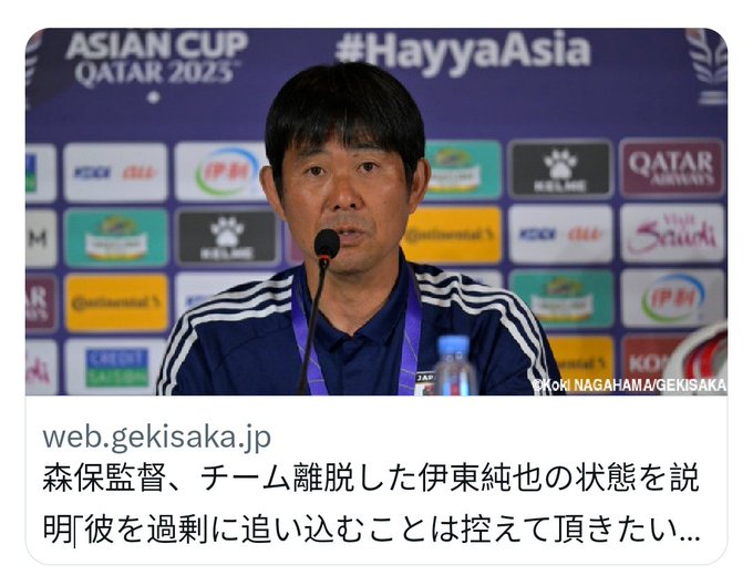 サッカー日本代表の森保一監督が2日、アジアカップ準々決勝イラン戦(3日)を前に、公式会見に臨んだ。直前に性加害報道がを受けて伊東純也(30)=スタッド・ランス=の離脱が正式に決定。