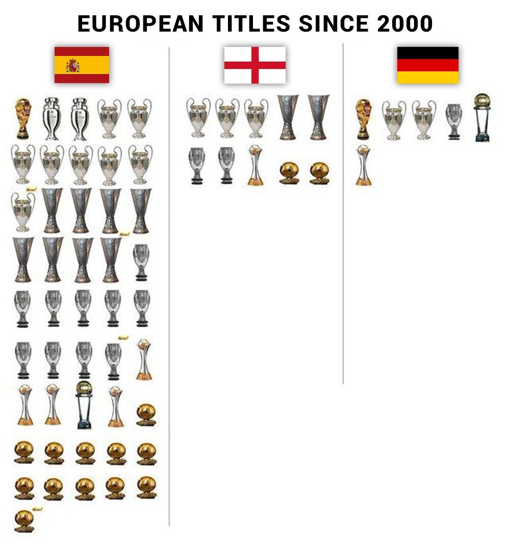 【悲報】プレミアリーグさん、2000年以降の欧州タイトルを比較したらリーガの1/5以下…