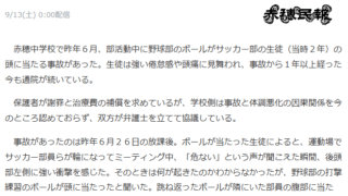 最新ニュース 【悲報】野球部のボールがサッカー部生徒の頭に当たり「脳しんとう」1年以上も通院が続く… 1: 名無し@サカサカ10 2025/09/13(土) 09:46:26.58 赤穂中学校で昨年6月、部活動中に野球部のボールがサッカー部の生徒(当時2年)の頭に当たる事故があった。生徒は強い倦怠感や頭痛に見舞われ、事故から1年以上経った今... 2025.09.13 最新ニュース